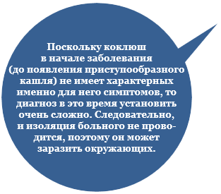 Коклюш протекает в несколько стадий. В первой стадии отмечается общее недомогание ребенка, небольшой кашель, насморк, повышение температуры. Постепенно кашель усиливается и к концу второй недели заболевания начи-нается период спазматического кашля, сопровождающийся приступами судорожного кашля при котором ребенку тяжело вдохнуть воздух. Кашель идет приступообразно и может заканчиваться выделением вязкой стекловидной мокроты, иногда в конце приступа отмечается рвота. Этот период протекает в течение 3–4 недель, затем приступы становятся реже и исчезают.
